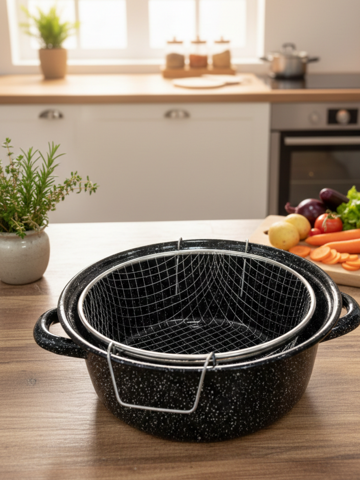 This 24 cm deep fryer pot features a strong enamel-coated body that distributes heat evenly and resists stains, rust, and high temperatures. The deep design helps prevent oil splatter while providing enough space to fry larger portions.