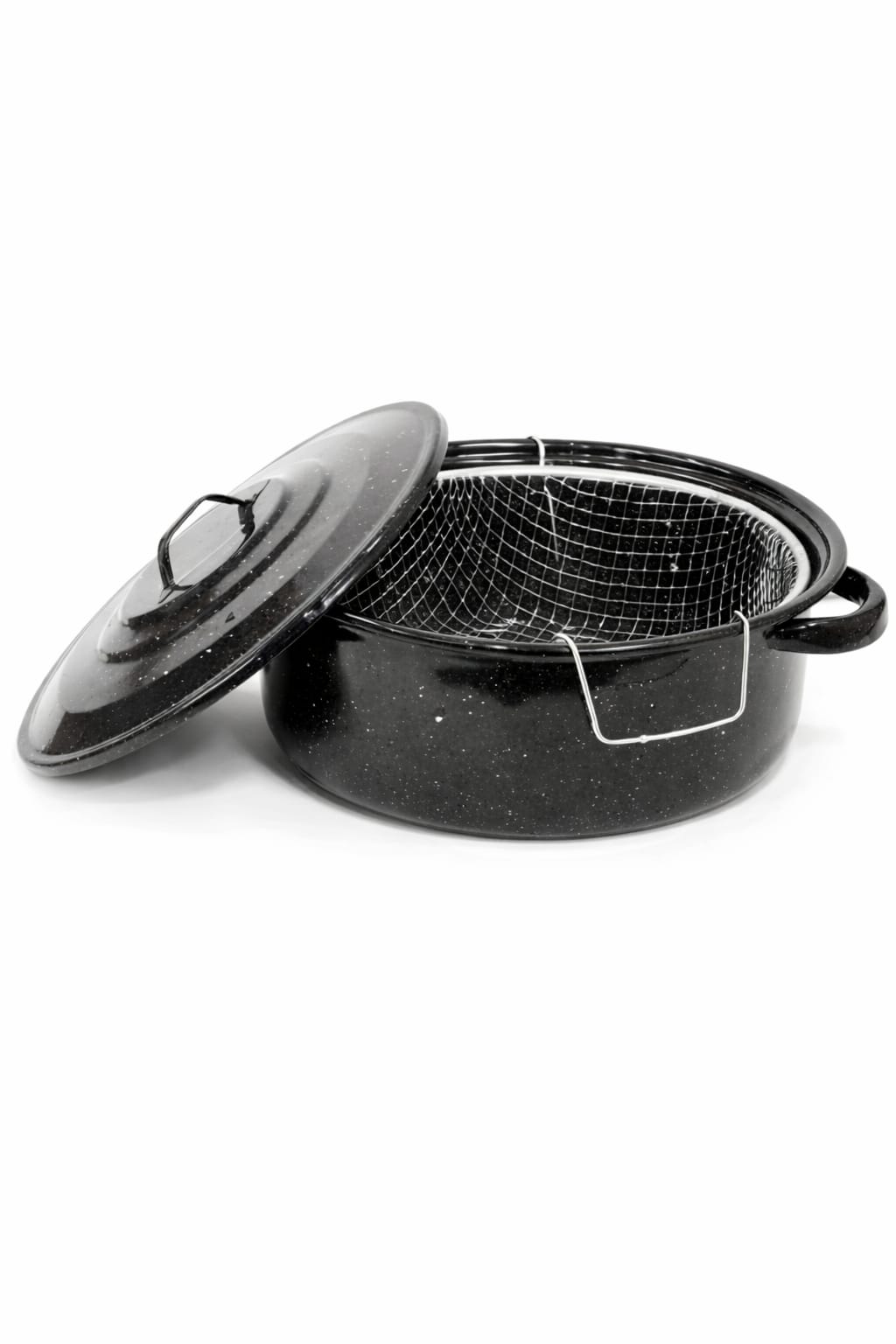 Crispy and delicious fried foods are easier than ever with this black enamel deep fryer pot with stainless steel strainer basket. Designed for home cooks and professional kitchens, this 9.5 inch (24 cm) deep frying pot ensures even heat distribution for perfect fries, chicken, seafood, and more. The durable enamel coating and removable stainless steel basket allow safe, convenient, and mess-free frying.