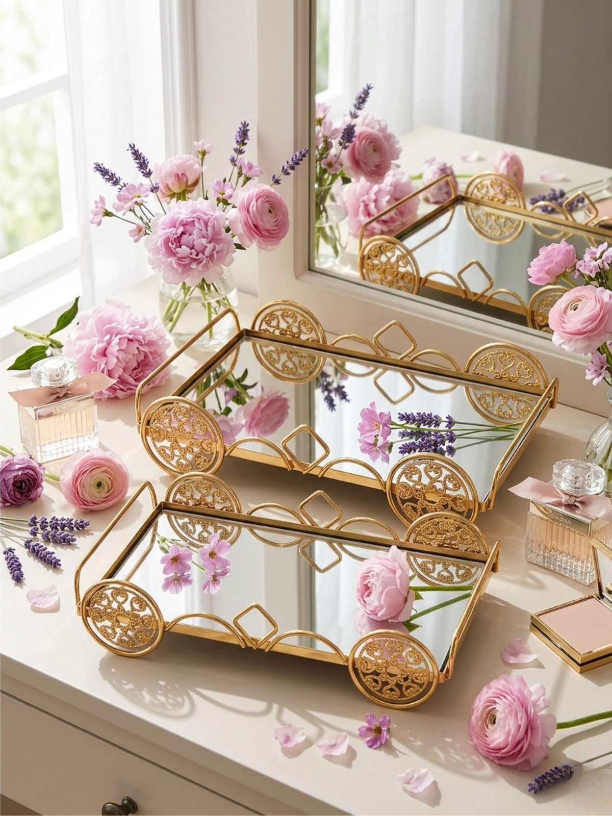 The reflective mirrored base adds depth and luminosity to any setting, making these trays ideal for displaying perfumes, jewelry, or cosmetics. They also work beautifully for serving coffee, tea, or desserts during gatherings, providing a luxurious and functional serving solution.