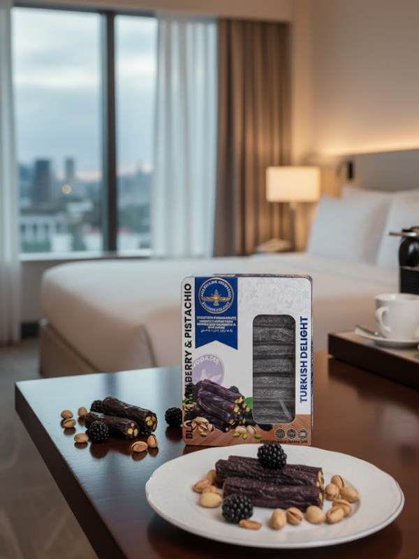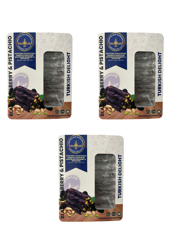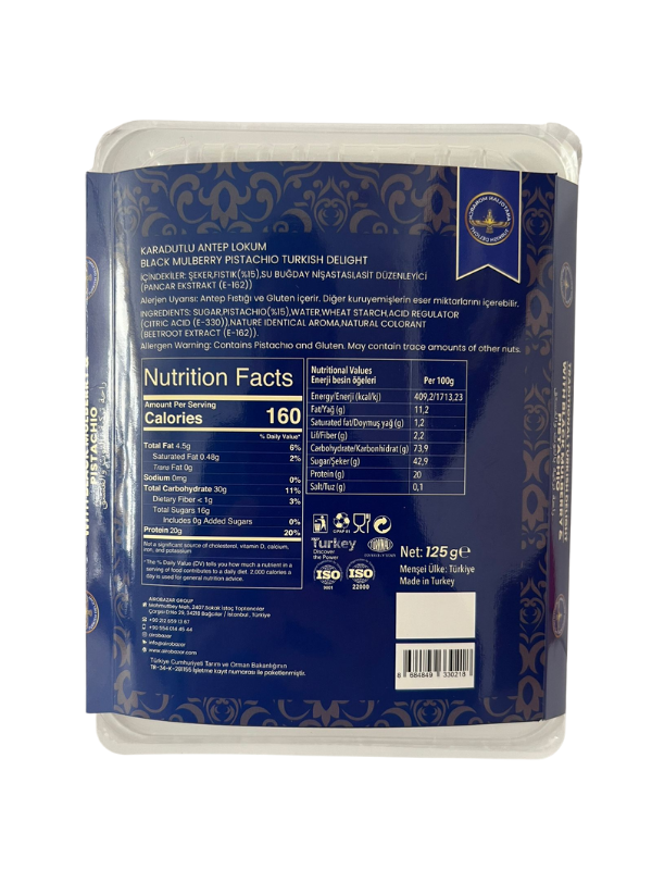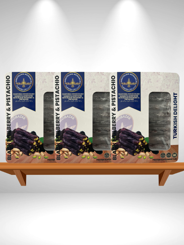 Crafted in small batches using traditional methods, this turkish delight combines the rich crunch of roasted pistachios with the natural sweetness and aroma of real blackberries.