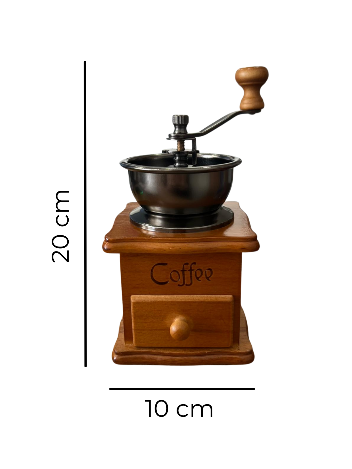 Standing 20 cm tall, this handcrafted grinder fits on any countertop. The smooth-turning hand crank with a comfortable wooden knob makes grinding coffee a pleasurable daily routine, ideal for coffee enthusiasts who love manual brewing.