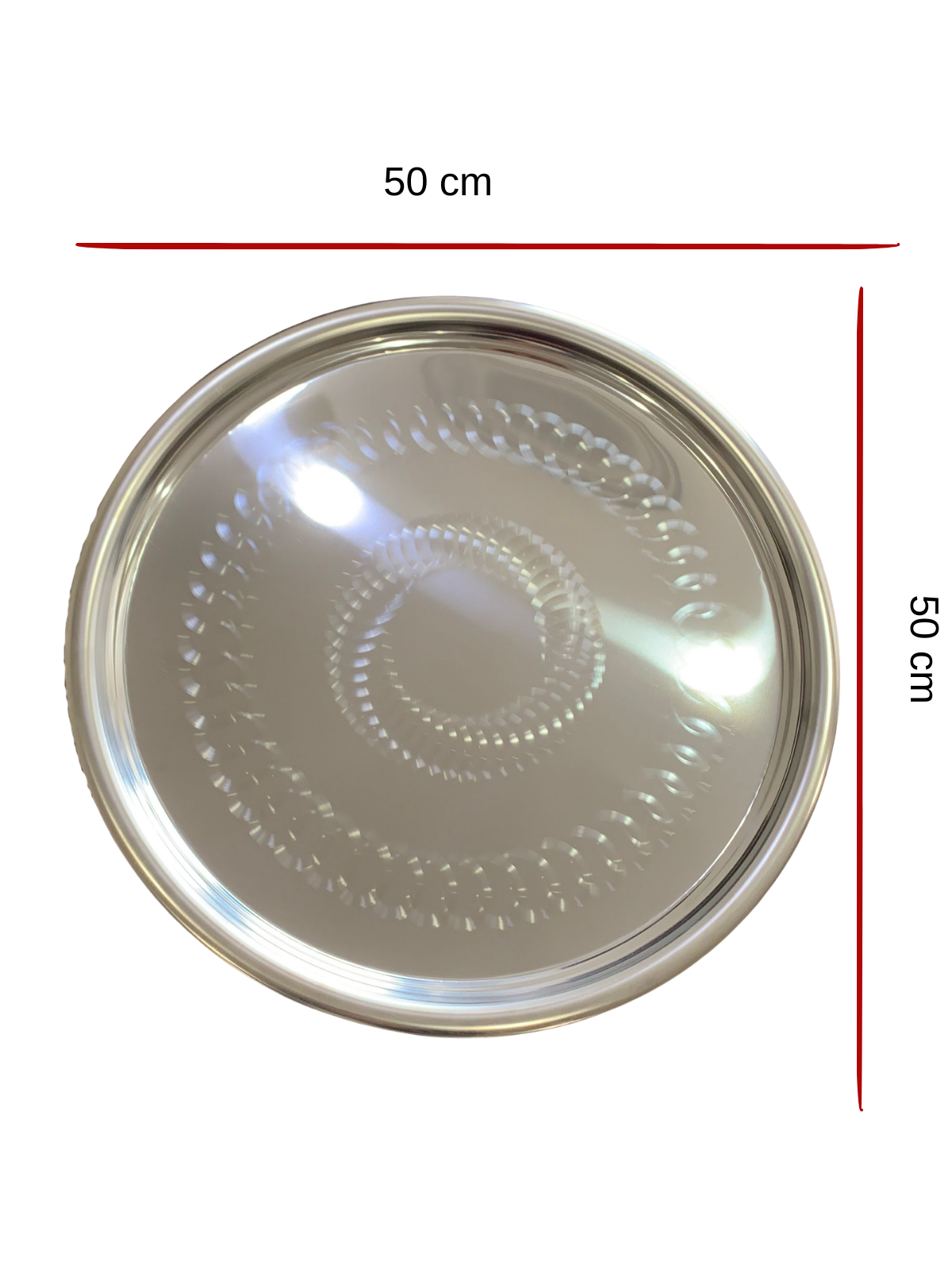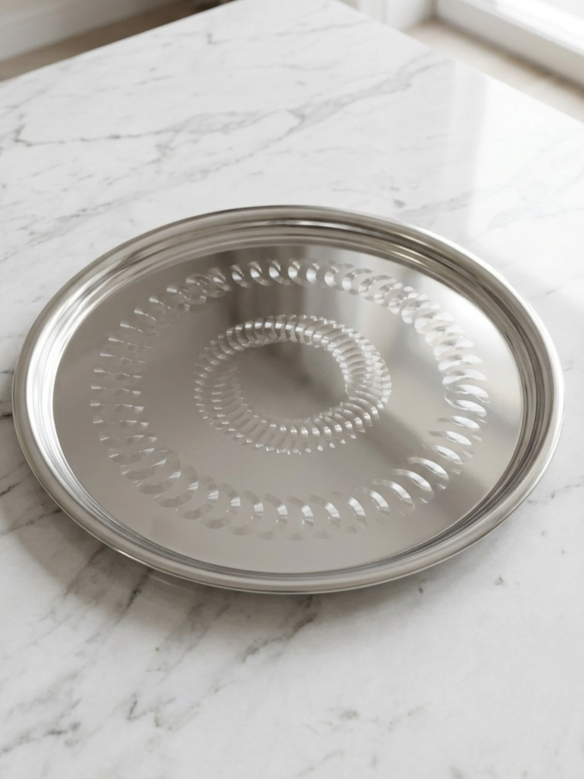 The polished chrome finish enhances the tray’s luxurious appearance while ensuring easy cleaning and long-lasting shine. The decorative etched circular pattern adds a sophisticated touch, making it ideal for both everyday dining and formal entertaining.
